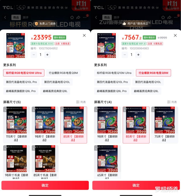 在多重新技术加持下,电视体验出现了显著提升,这也大幅增加用户的换机意愿。今年双11期间,头部电视品牌带着多款搭载新技术的重点产品加入战局,以TCL为例,发售价27999元的Q10M Ultra(85吋)京东最新价格23395元(含焕新补贴);发售价11999元的Q9M(85吋)京东最新价格7567元(含补贴),折扣力度明显。与此同时,TCL旗下爆款产品QD-Mini LED电视T7L Ultra在双11再度让利,75吋从此前的5399+元降到4957.68元。(笔者注:TCL电视双11优惠力度大,每天价格均在波动,以上价格统计时间为2025年10月27日17:52)
